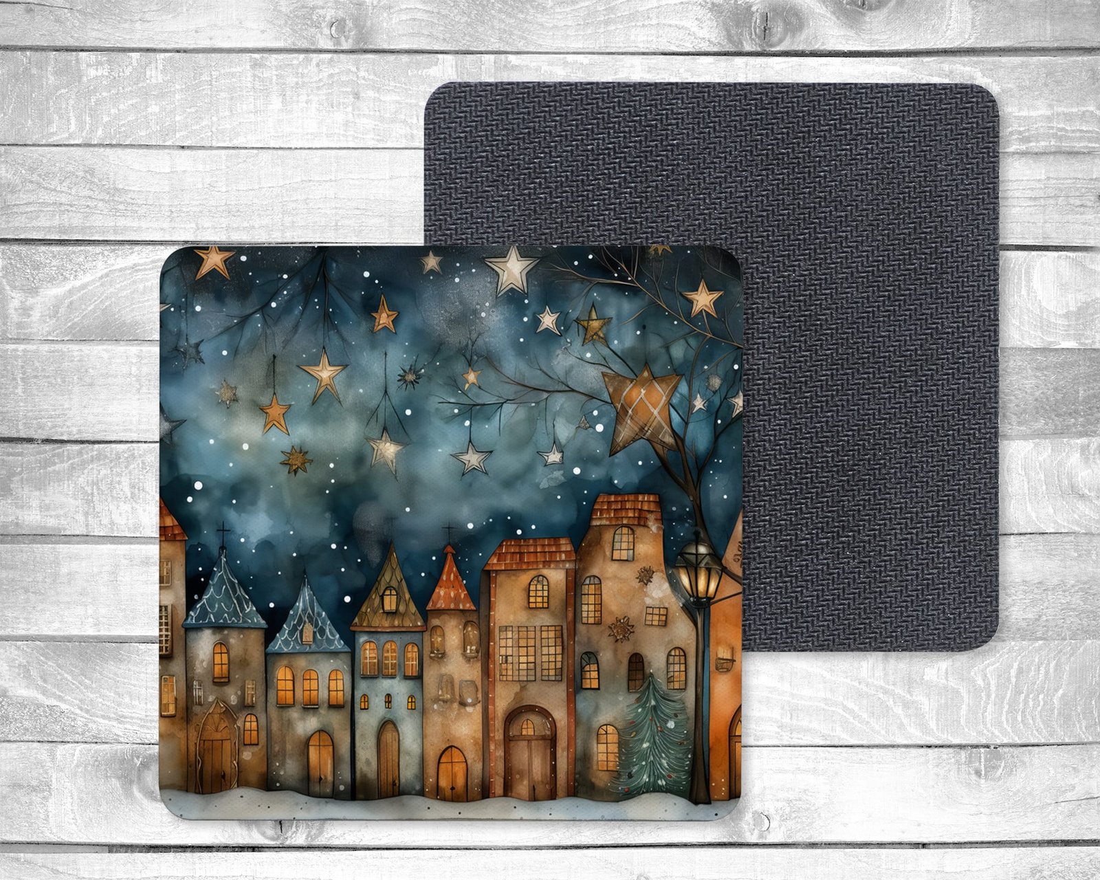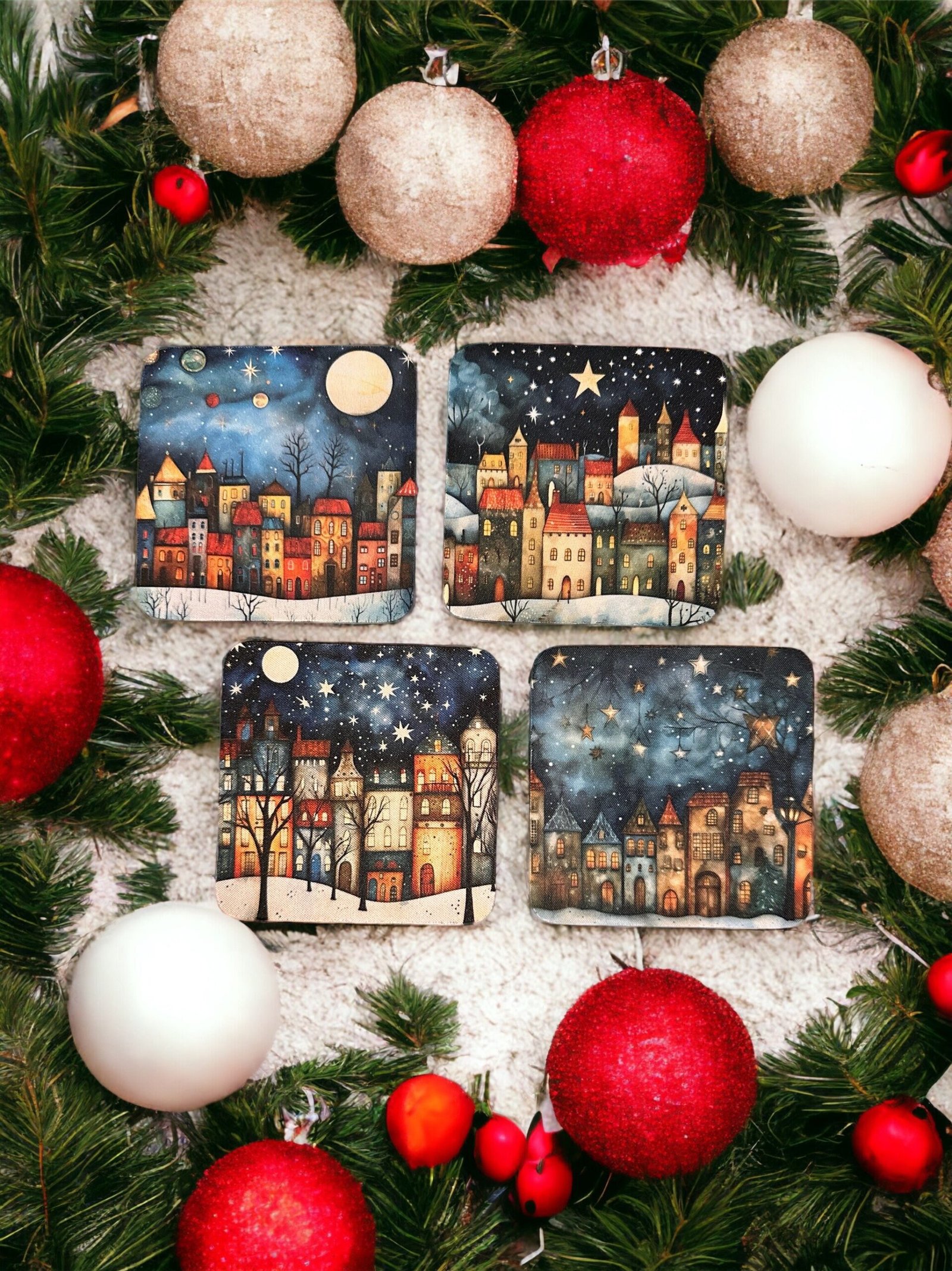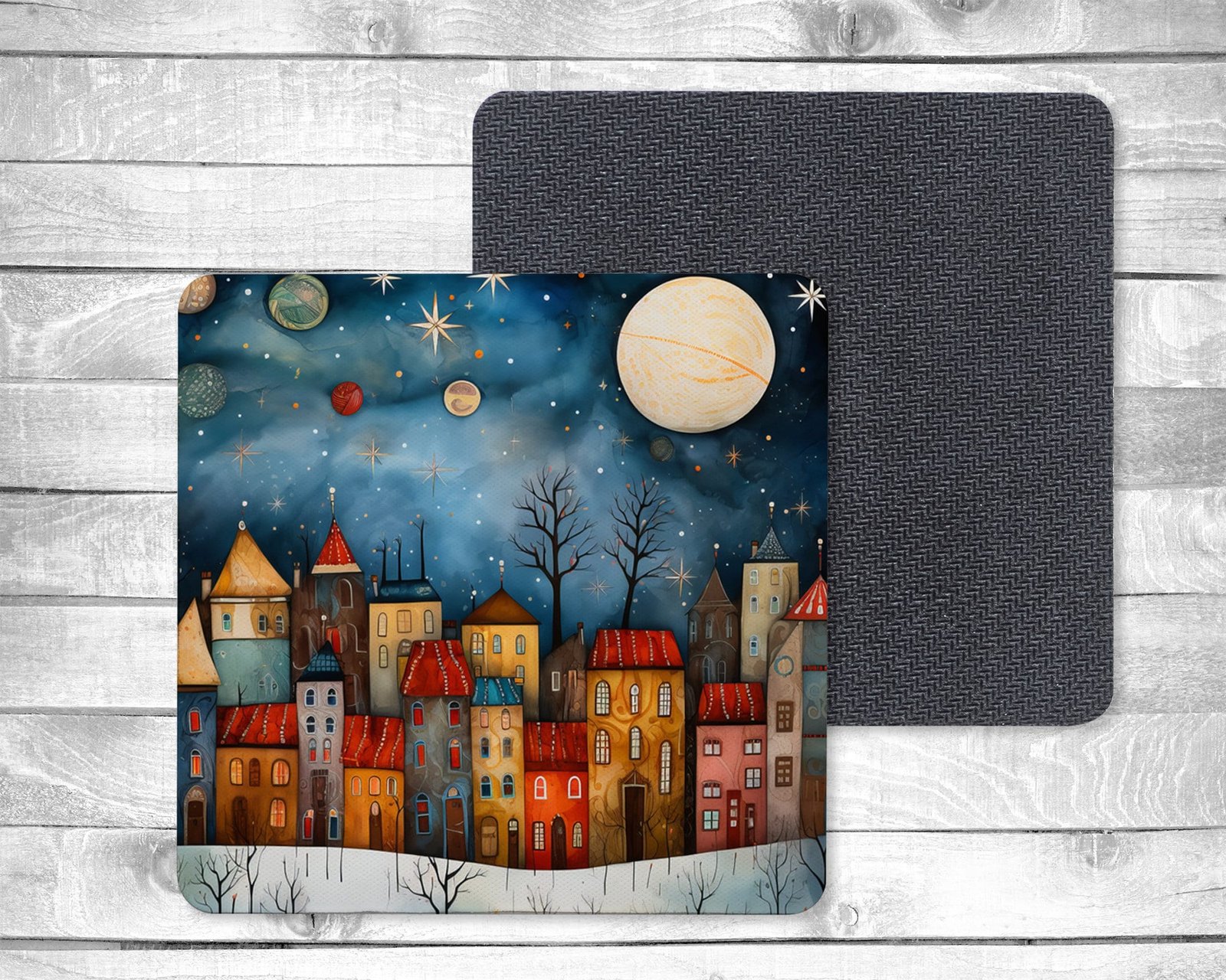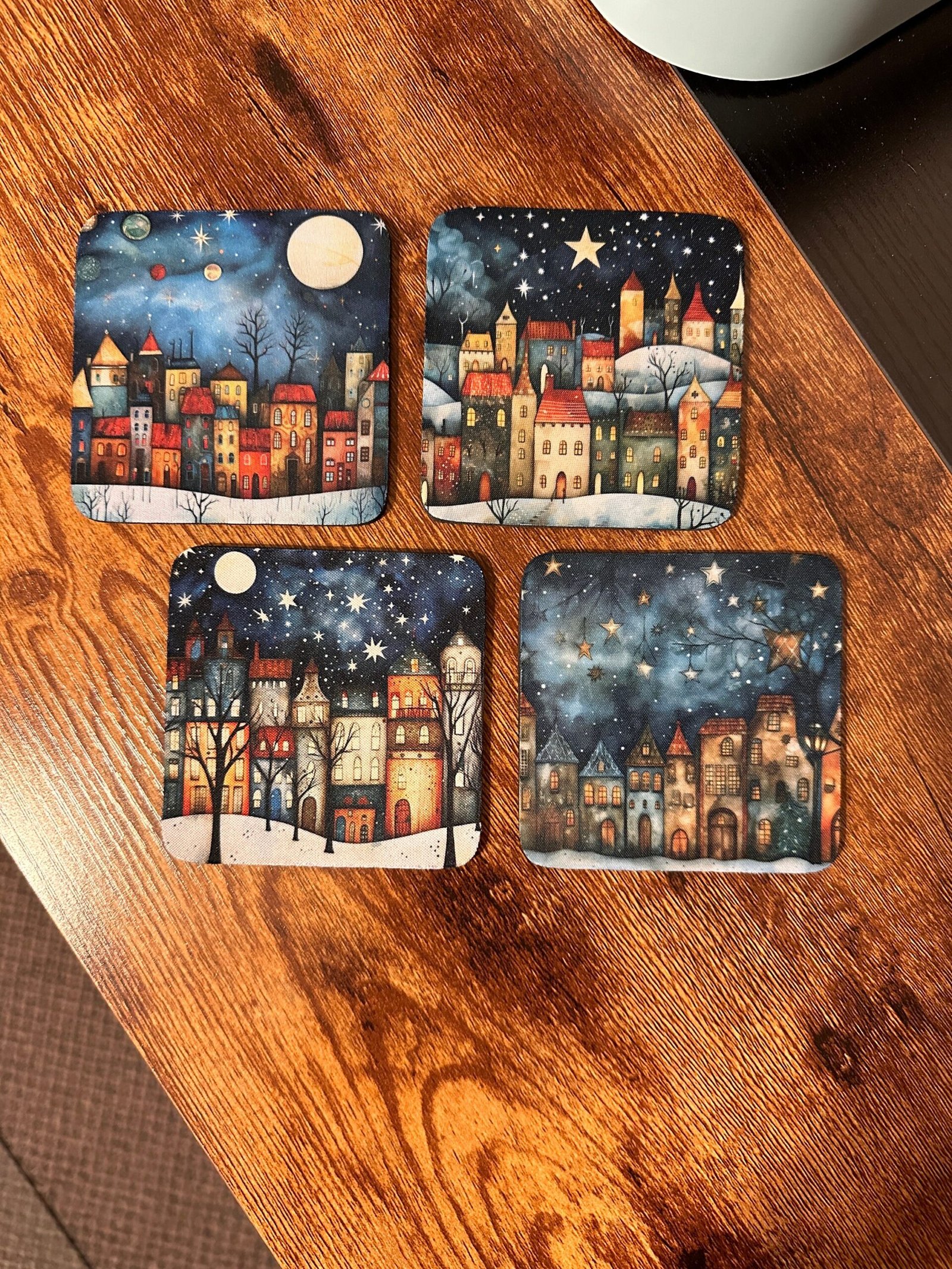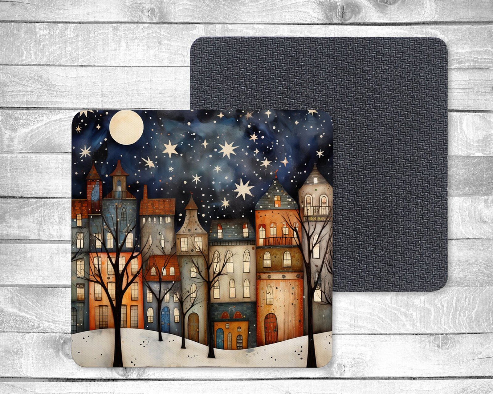 Snowy Night, Absorbent Drink Coasters, Individual or set of, Non-Slip Base, Neoprene, Winter, Season, Gift,